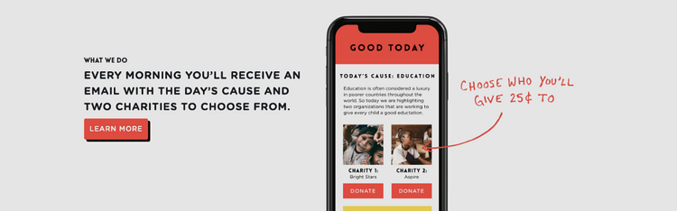 Using a different mechanism is Good Today. The ‘Netflix for charity’ has nailed the mechanism for effortless yet engaged giving: pick between two charities each day and decide which one to give 25¢.