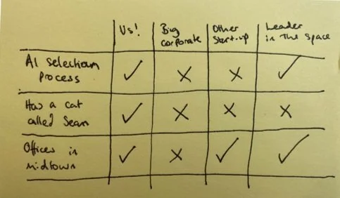 Yet, in practice, it’s almost always poorly applied. In most cases I see, the focus is on specific features that are meaningless in a competitive context. For example, comparing whether different companies have ‘AI assessment process’ or ‘responsive UX’. And I’m always kinda like, ‘who cares?’.