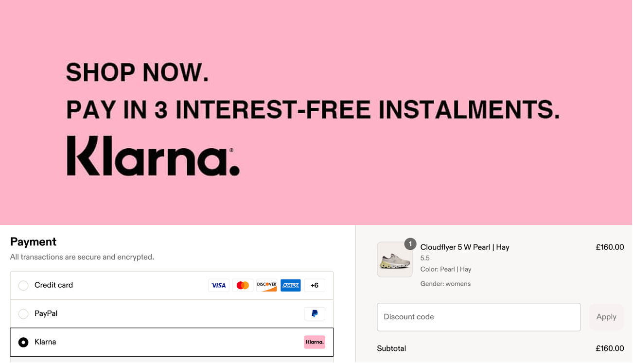 The big hitter. We’ve all seen the tempting offer as you hover at the payment page of the latest On Cloud shoe (the Pearl colourway, of course). Split this into three, four separate payments? Pay in 30 days? Go on then…