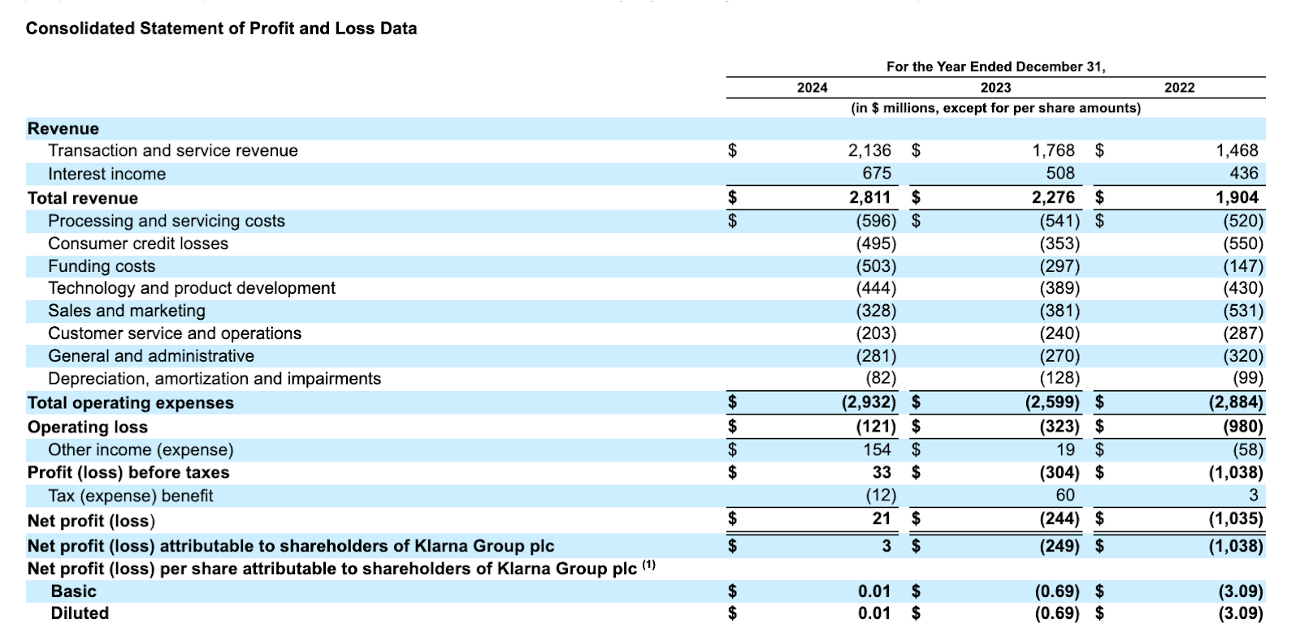 The headline here is that the combination of growth and cost cuts means that Klarna is back to profitability. The subheading is that this was only made possible by the non-core ‘other income’ but given the trajectory of the cost cuts and revenue growth, it looks like ‘true’ profitability should be in store for 2025. This outlook is bolstered by the fact that Klarna, fairly remarkably in the context of how most ‘growth companies’ typically operate, managed to maintain positive net income all the way from 2005 to 2018, only taking a hit when entering the US market.